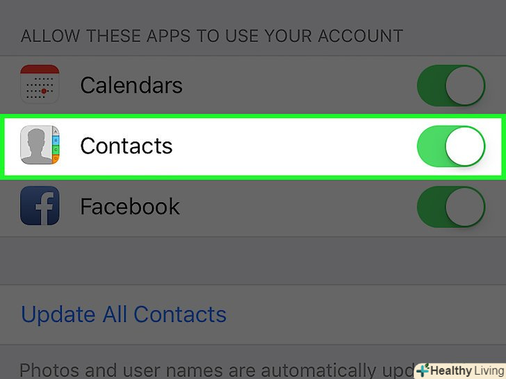 Переконайтеся, що перемикач поруч з полем " контакти "поставлений в положення"ВКЛ".Ваш iPhone тепер синхронізований з вашими контактами Facebook.- Ваші контакти не будуть автоматично оновлюватися в міру того, як ваші друзі будуть оновлювати свою інформацію або у вас будуть з'являтися нові друзі. Щоб оновити інформацію, поверніться на сторінку Налаштувань Facebook (Налаштування gt; Facebook) та натисніть «Оновити всі контакти».
