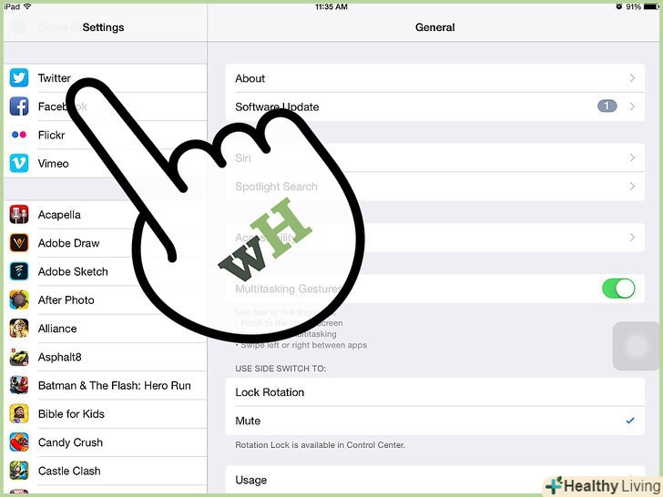 Знайдіть іконку Twitter в опціях налаштувань. Знайдіть іконку Twitter в опціях налаштувань.