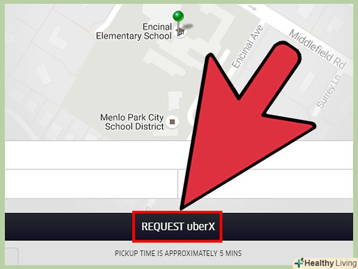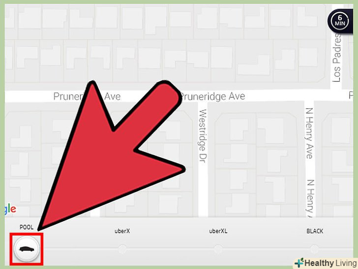 Виберіть тип сервісу Uber.внизу екрана ви побачите різні типи автомобілів Uber, а під ними рухається значок. Перетягніть цей значок до того типу машин Uber, який хочете замовити. Виберіть тип сервісу Uber.внизу екрана ви побачите різні типи автомобілів Uber, а під ними рухається значок. Перетягніть цей значок до того типу машин Uber, який хочете замовити.- UberX-пропозиція стандартного сервісу від Uber. Прочитайте статтю "Як вибрати Тип автомобілів Uber", якщо не знаєте, який тип машин Uber хочете вибрати.
