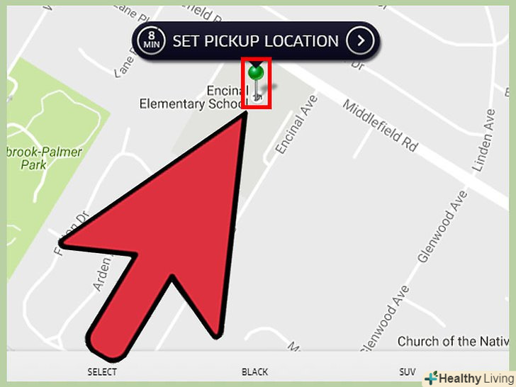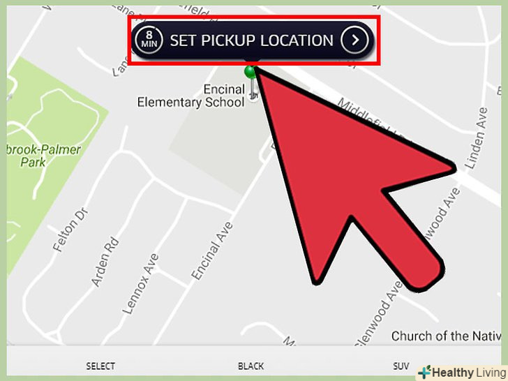 Введіть своє місце розташування.Uber не завжди може визначити ваше місце розташування автоматично-Це залежить від налаштувань пристрою, який ви використовуєте. Якщо ви з цим зіткнулися, введіть місце розташування вручну. Введіть своє місце розташування.Uber не завжди може визначити ваше місце розташування автоматично-Це залежить від налаштувань пристрою, який ви використовуєте. Якщо ви з цим зіткнулися, введіть місце розташування вручну.- Натисніть на біле поле під зеленим заголовком "місце посадки" і введіть своє поточне місце розташування. В середині екрану з'явиться чорний напис" вказати місце посадки " і шпилька — пересуньте її в вказане Вами місце.[2]