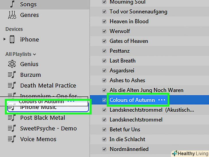 - Якщо ви хочете вручну додавати музику на iPhone, ви можете перетягувати пісні з бібліотеки iTunes на іконку вашого iPhone в бічній панелі iTunes.