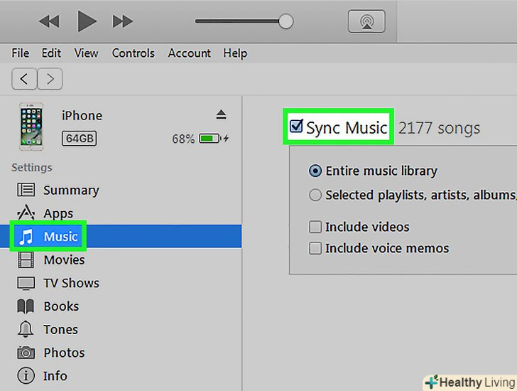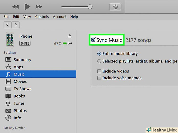 Знайдіть пункт синхронізувати музику і відзначте його галочкою. цей пункт знаходиться у вкладці музика у вікні управління iPhone. Перегляньте параметри під пунктом синхронізувати музику і виберіть ті, які вам підходять. Знайдіть пункт синхронізувати музику і відзначте його галочкою. цей пункт знаходиться у вкладці музика у вікні управління iPhone. Перегляньте параметри під пунктом синхронізувати музику і виберіть ті, які вам підходять.- Щоб синхронізувати всю музику, виберіть всю медіатеку.