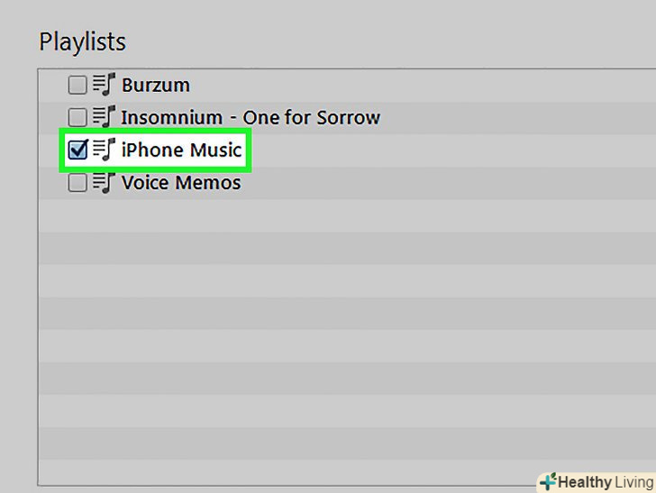 Виберіть Вибрані плейлисти, артисти, альбоми та жанри у вкладці Музика.позначте списки відтворення, які потрібно синхронізувати. Виберіть Вибрані плейлисти, артисти, альбоми та жанри у вкладці Музика.позначте списки відтворення, які потрібно синхронізувати.