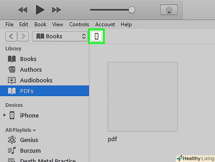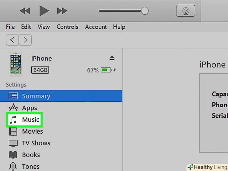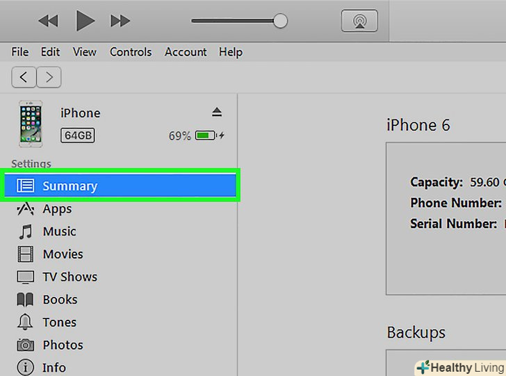 Виберіть iPhone.залежно від версії iTunes, ваш iPod буде відображатися або в лівому меню в розділі пристрою, або в правому верхньому куті вікна iTunes. Виберіть iPhone.залежно від версії iTunes, ваш iPod буде відображатися або в лівому меню в розділі пристрою, або в правому верхньому куті вікна iTunes.