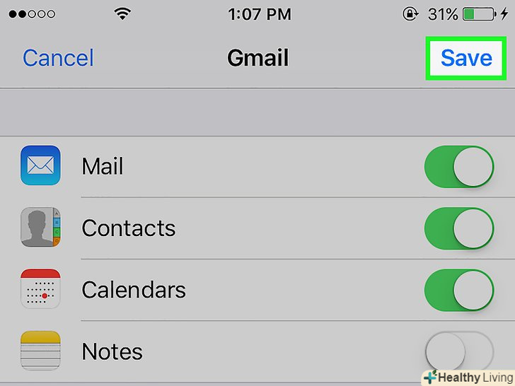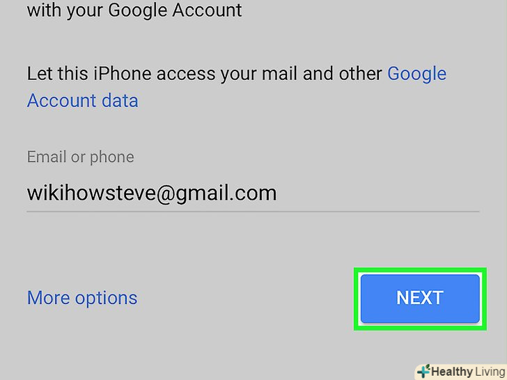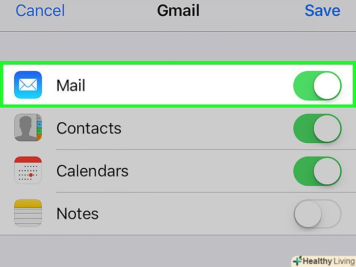 Пересуньте повзунок біля "Пошта «в положення»включити". Він стане зеленим. Пересуньте повзунок біля "Пошта «в положення»включити". Він стане зеленим.- Щоб вибрати інші дані Gmail, які будуть синхронізовані з iPhone, пересуньте відповідні повзунки в положення»включити".