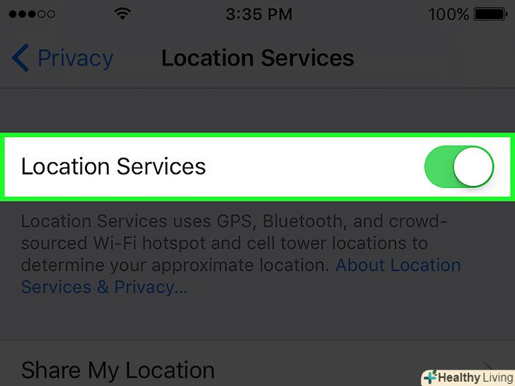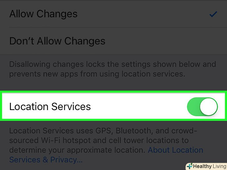 Пересуньте повзунок уСлужби геолокації в положення «включити». ви знайдете цю опцію під «дозволити".[1] Пересуньте повзунок уСлужби геолокації в положення «включити». ви знайдете цю опцію під «дозволити".[1]