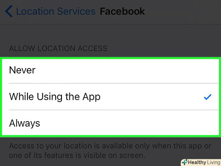 Натисніть на додаток, щоб налаштувати його геолокацію. коли ви торкнетеся програми, відкриються параметри геолокації даного додатка. Натисніть на додаток, щоб налаштувати його геолокацію. коли ви торкнетеся програми, відкриються параметри геолокації даного додатка.- Виберіть "Ніколи", щоб повністю відключити геолокацію цього додатка.