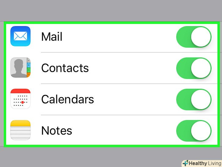 Увімкніть або вимкніть компоненти Exchange.для цього пересуньте повзунки у відповідних опцій: вправо, щоб включити компонент (опція стане зеленою), або вліво, щоб відключити його (опція стане білою). Синхронізувати можна наступні компоненти:- Пошта