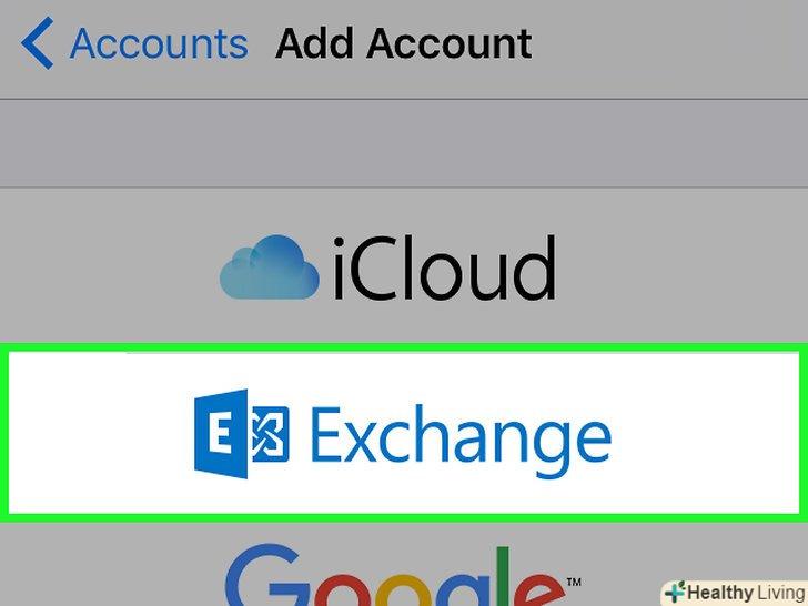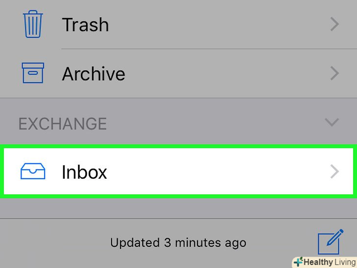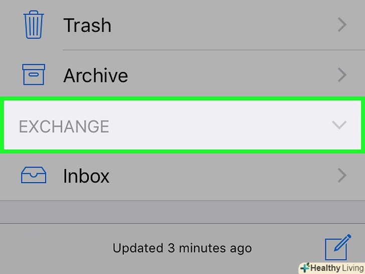 Прокрутіть вниз до розділу "Exchange".його розташування на сторінці "поштові скриньки" залежить від інших поштових акаунтів, які ви синхронізували.- Якщо в додатку» пошта " відкрилася папка з вхідними повідомленнями іншого сервісу (наприклад, Gmail або iCloud), спочатку натисніть кнопку «Назад» у верхньому лівому кутку екрану.