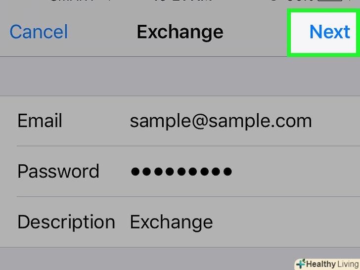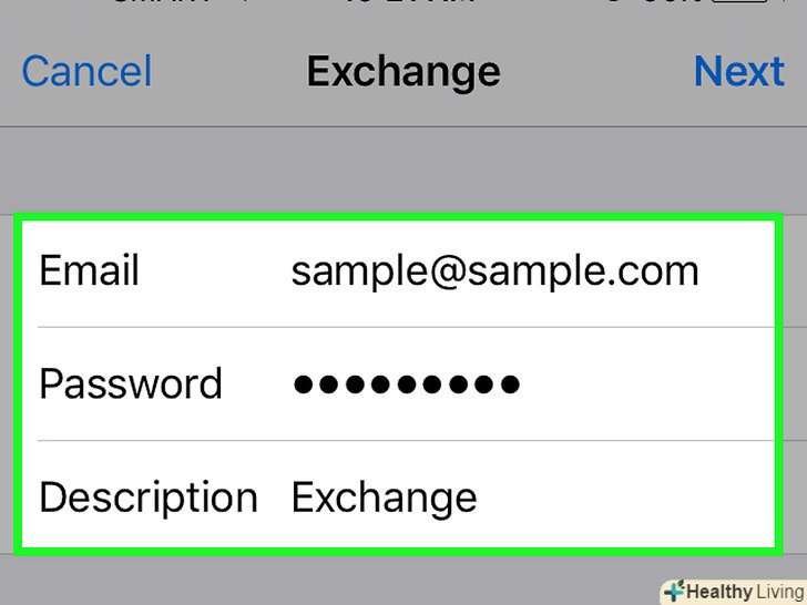 Введіть дані свого облікового запису Exchange. необхідно вказати наступну інформацію:- Електронна пошта-адреса електронної пошти Exchange.