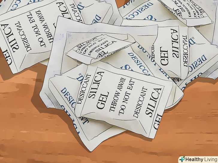 Знайдіть кілька пакетиків з синтетичним вологопоглиначем. пакетики з синтетичним вологопоглиначем-це Пакети розміром близько 2 см, які вкладають в упаковку з різними товарами, такими як взуття та шкіряні вироби, сушені продукти (наприклад, в'ялена яловичина або спеції) і електронні пристрої. Ці пакетики, як правило, наповнені кульками силікагелю, які мають сильні абсорбуючі властивості і можуть витягнути вологу з телефону. Пакети не потрібно розривати. Просто покладіть їх на телефон і почекайте, поки вони не поглинуть всю вологу.[3]- Цей метод застосуємо лише в тому випадку, якщо ви заздалегідь збирали пакетики з силікагелем протягом декількох місяців. Втім, це непогана ідея: смартфони є у багатьох, і впустити свій смартфон в воду може кожен.