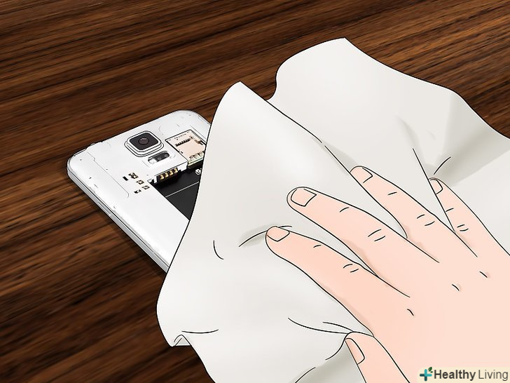 Здуйте воду з компонентів телефону і витріть їх насухо рушником.Подуйте на електричні деталі телефону, щоб видалити більшу частину води. Протріть деталі телефону чистим сухим рушником, щоб видалити залишилася вологу з поверхні деталей. Для видалення вологи, що проникла всередину компонентів телефону, використовуйте висушують кошти.[7]- Замість того щоб здувати воду, спробуйте струсити деталі телефону, щоб висушити їх. Постарайтеся при цьому випадково не кинути батарею через всю кімнату.
