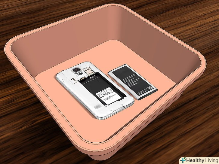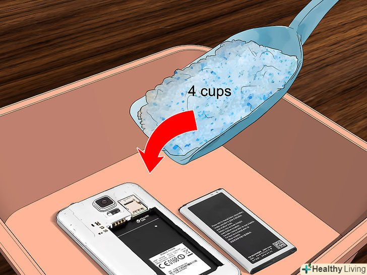 Висипте на телефон не менше 4 склянок (340 грамів) висушуючого засобу.який би засіб ви не вибрали, не скупіться. Вам знадобиться значна кількість засобу, щоб видалити останні залишки води з електричних компонентів телефону.[9]- Накрийте ємність кришкою, якщо ви використовуєте неїстівний засіб, такий як силікагель.