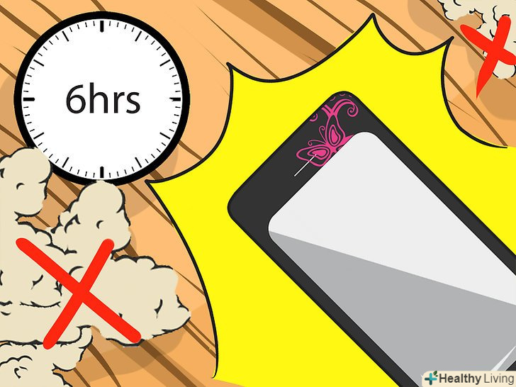 Нехай телефон висохне.Тримайте його подалі від бруду і пилу, що може налипати на невисохлий малюнок. Залиште телефон сохнути як мінімум на 6 годин і навіть якщо вам буде здаватися, що лак висох швидше, він все ще буде м'яким і гнучким, тому навіть легкий дотик може залишити слід.