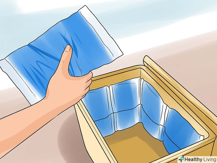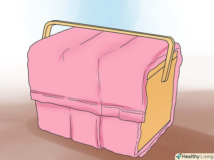 Перш ніж помістити кубики льоду в контейнер або відерце, постеліть в нього рушник.воно ізолює лід від стінок і допоможе зберегти низьку температуру. Для кращої теплоізоляції можна викласти стінки контейнера пухирчастою упаковкою, а потім вже на неї постелити рушник.[5]- Заповнивши контейнер або відерце льодом, обов'язково накрийте його кришкою, щоб в нього не надходило тепле повітря зовні.