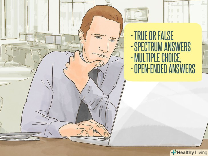 Подумайте, як ви будете оцінювати успішність.[5][6] після складання навчальних цілей ви захочете упевнитися, що ваші учні прагнуть їх досягти. Зазвичай для цього існує оцінка поточних завдань і проектів, але можна використовувати і інші варіанти. Складіть досить докладний опис завдань / інструментів оцінки знань, які стануть частиною навчальної програми. Нижче наводяться поширені приклади оцінки знань студентів:- Тестові опитування та іспити