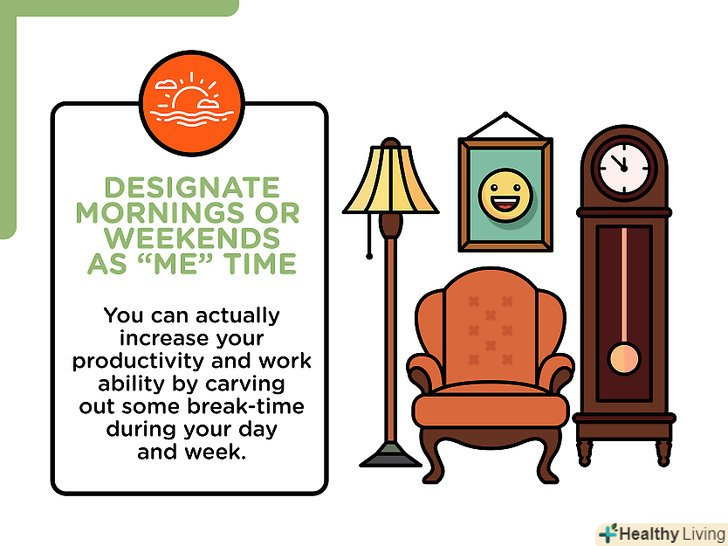 Відведіть ранок і вихідні на час "для себе".це може звучати парадоксально, однак ви зможете по-справжньому збільшити продуктивність і здатність до роботи, роблячи невеликі перерви протягом дня і тижня.[14]- Проведіть перші пару годин з ранку, займаючись тим, що вам подобається: пограйте з дітьми, сходіть на прогулянку з собакою, займіться йогою і так далі. Це допоможе вам очистити розум і зарядитися хорошим настроєм на день, що в свою чергу дасть вам можливість не втрачати концентрацію і працювати швидше.