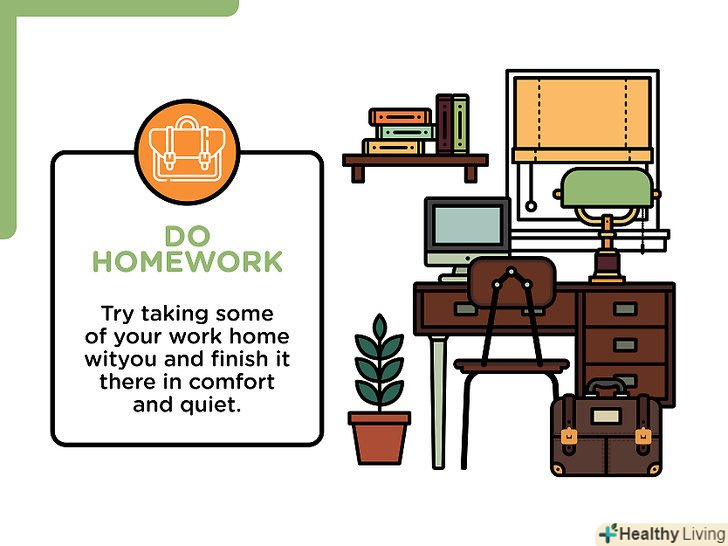 Робіть домашні завдання.школа та офіс не завжди є ідеальним місцем для завершення роботи, тому що там може бути шумно і повно відволікаючих чинників. Щоб боротися з цим, спробуйте працювати вдома, завершуючи завдання в тиші і комфорті.[15]