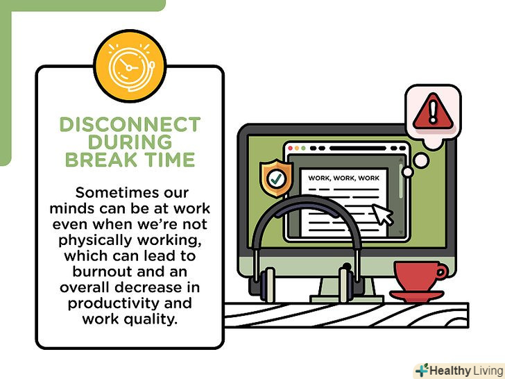 Відключіться під час перерви.іноді наш мозок може бути на роботі навіть без нашої фізичної присутності там. Це призводить до того, що людина згорає на роботі, а його загальна продуктивність знижується, так само як і якість роботи.[16]- Заведіть роздільні акаунти з особистою і робочою Поштою і лімітуйте кількість переглядів робочої Пошти під час вихідних.