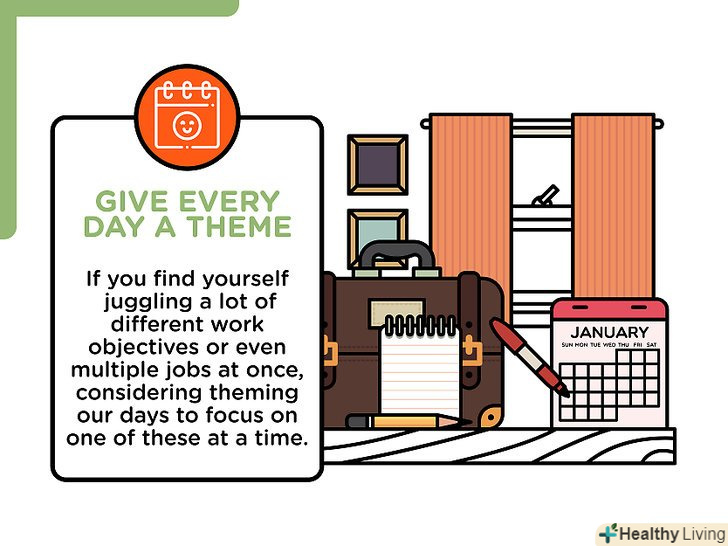 Присвячуйте кожен день певній тематиці.якщо ви помітили, що вам потрібно зробити багато різних справ, причому щось одночасно, подумайте, чи не зможете ви присвятити день чомусь одному.[2]- Якщо ви студент, ви можете спробувати виділити певні дні під певні предмети. Наприклад, понеділок - для завдань з природничих наук на весь тиждень, а вівторок – на математику.