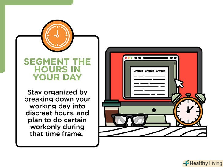 Діліть день по годинах.щоб залишатися організованим, розділіть робочий день на певні години, плануючи виконати будь-яке завдання за конкретний часовий відрізок.[3]- Наприклад, в першу годину ви можете відповідати на електронні повідомлення і телефонні дзвінки.