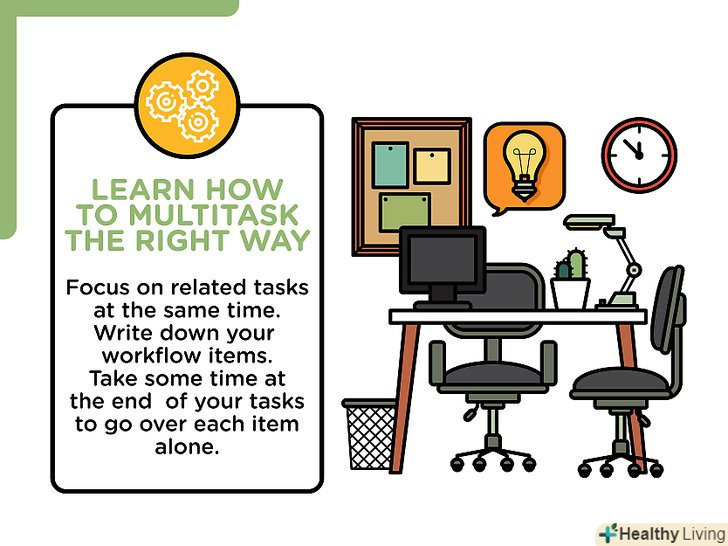НавчітьсяБагатозадачності прямо зараз. це може виявитися палицею на двох кінцях: з одного боку, ця стратегія корисна, коли потрібно зробити багато речей за короткий час, а з іншого боку, вона може розтягнути час і знизити рівень вашої уваги, що призведе до низької якості роботи.[4] щоб скористатися всіма перевагами мультизадачності, дотримуйтесь наступних порад:- Зосередьтеся на схожих завданнях в один і той же час. Скоротіть кількість ментальної енергії, яку витрачаєте, перемикаючись з одного завдання на інше. Замість цього, зв'яжіть разом свої справи. Наприклад, відповідайте відразу і на електронну, і на голосову, і на звичайну пошту.[5]