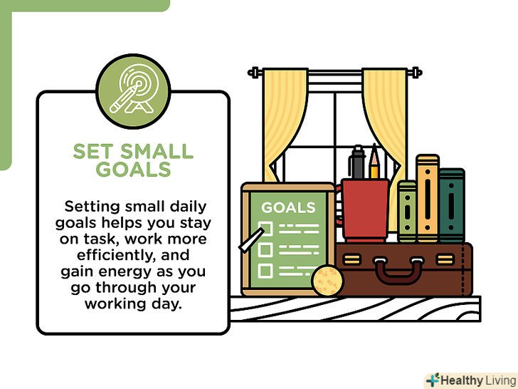 Встановлюйте невеликі цілі.Установка маленьких цілей допоможе вам дотримуватися завдання, працювати ефективніше і набирати енергію протягом робочого дня.[7]- Розправившись з незначними справами, такими як похід в магазин або виконання дрібниць, ви зможете сконцентруватися на чомусь більш масштабному, що потрібно закінчити до кінця цього дня.