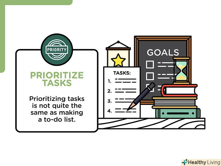 Встановіть пріоритети. пріоритетні завдання – це не просто список справ. Швидше це категоризація списку на дрібні і незначні завдання і на завдання, які більш важливі і скрутні.[8]- Складіть хронологічний список, коли і які справи потрібно зробити. Почніть з тих, що на вершині списку і тих, які потрібно виконати якомога швидше.