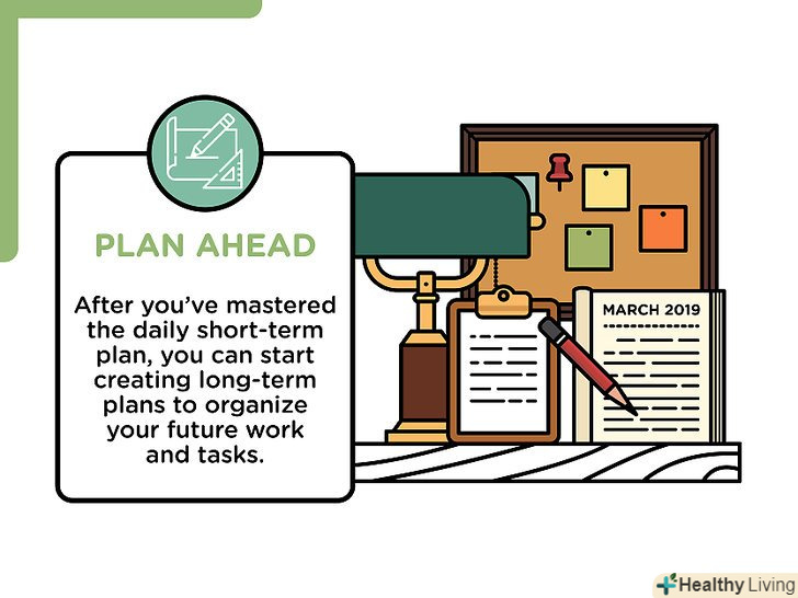 Плануйте заздалегідь.як тільки ви в майстерності оволодієте веденням щоденного короткочасного плану, можна почати планувати довгострокові проекти, щоб організувати майбутню роботу і завдання.- Якщо ви будете заздалегідь знати, що потрібно зробити (будь то курсова до кінця семестру або поїздка на міжнародну конференцію), ви завжди будете на крок попереду.[9]