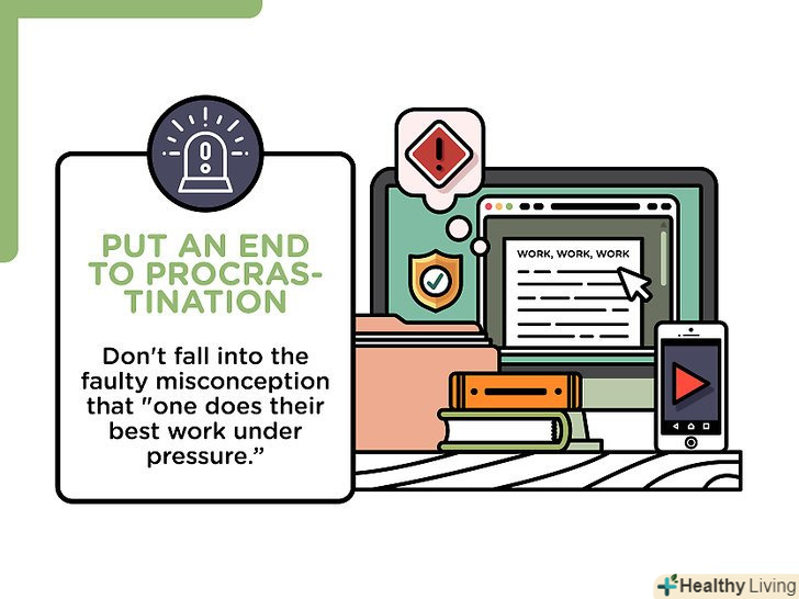 Припиніть відкладати на потім.багато хто з нас відкладають речі на потім (особливо ті, що нам не подобаються), що негативно впливає на нашу продуктивність, так само як і на загальну якість роботи.- Не піддавайтеся помилковій концепції, що"люди працюють краще, перебуваючи під тиском". Психологічні дослідження показали, що більшою мірою це не так![10] Люди, які тягнуть до останньої хвилини, часто роблять менше і роблять більше помилок в роботі.