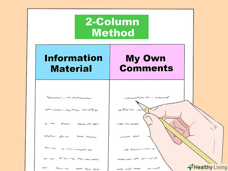 Ведіть записи методом двох стовпців.розділіть сторінку на два стовпці, щоб зручно вести записи. У лівому стовпці вказуйте інформацію і матеріали, які зустрічаються в процесі читання, включаючи номери сторінок, короткі конспекти і цитати, а в правому стовпці залишайте свої коментарі.[13]- Інформація в лівому стовпці служить двом основним цілям: по-перше, якщо ви захочете знову повернутися до певного моменту, то потрібно знати, де він знаходиться в книзі; по-друге, такі дані потрібно вказувати у всіх посиланнях і згадках.
