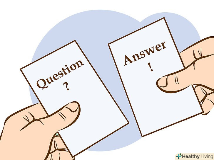 Перевіряйте один одного.Задавайте один одному потенційні екзаменаційні питання. Можна використовувати флеш-картки або попросити друга підготувати нові питання, про які ви навіть не думали. З одним навіть власні питання сприймаються трохи інакше. Напевно один буде вимагати від вас максимально докладних відповідей.