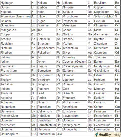 - Знайте, які елементи завжди втрьох. елементи можуть мати три літери. Але, можливо, вам не потрібно буде їх вивчати. Це дуже радіоактивні і нові елементи, які можуть отримати нові назви, коли винаходи підтвердяться. Професійні хіміки часто не використовують їх імена, а називають їх, наприклад, «елемент 113». Але, на всякий випадок, ось список цих елементів: