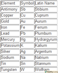 - Вивчіть латинські імена.всі символи елементів можуть бути англійськими абревіатурами, крім десяти елементів, у яких латинські імена, і один елемент (Вольфрам), у якого німецька назва. Всі ці елементи, крім сурми і вольфраму, використовуються часто.