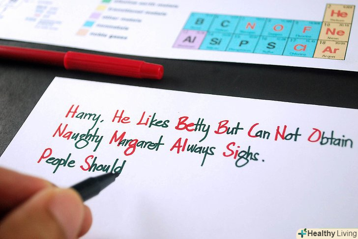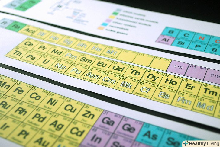 Використовуйте мнемонічну техніку.це означає, що ви можете використовувати слова, які будуть асоціюватися з кожним елементом. Ви можете створювати цілі віршики, щоб запам'ятати ряд елементів.- Ігноруйте прості елементи. Ви, швидше за все, вже точно знаєте, що водень це «н». Зосередьте свою увагу на тих елементах, які складні для вас.