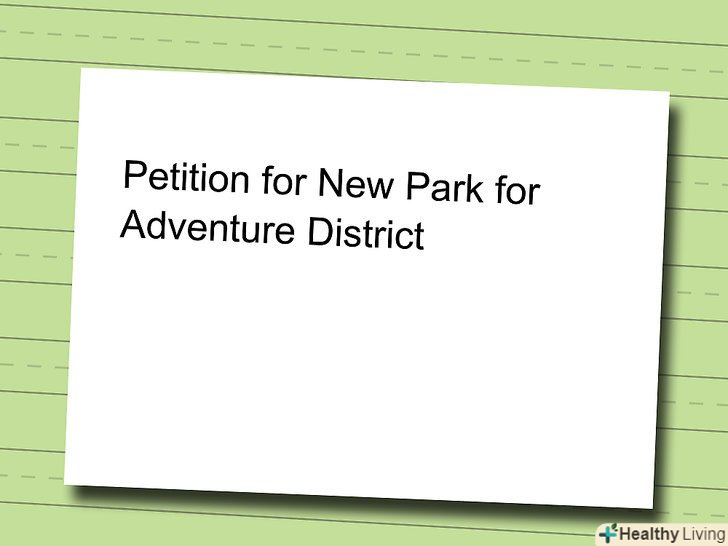 Створіть підписний бланк на окремому аркуші паперу.помістіть назву петиції на самому верху. Назва вашої петиції має бути коротким, але наочним.- Приклад назви петиції: петиція про новий парк в районі розваг
