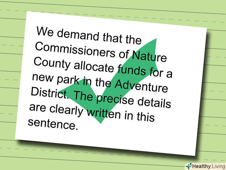 Придумайте дуже специфічне гасло, що підкреслює те, як ви хочете, має бути підтримано людьми.він повинен бути точним, коротким і інформативним.- Слабкий:Ми підтримуємо виділення більшої суми коштів на фінансування парку. ця пропозиція є занадто загальним. Який парк? Скільки коштів?