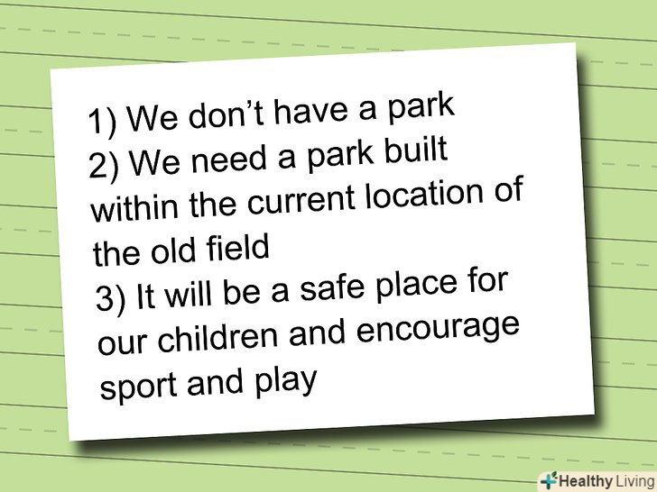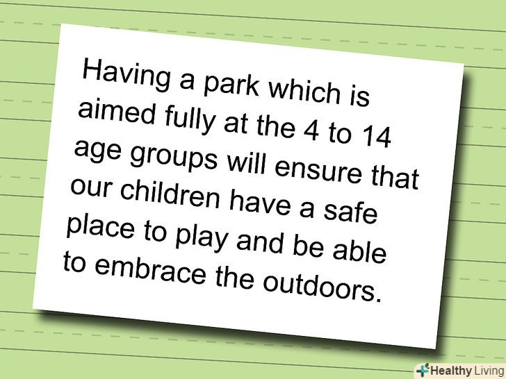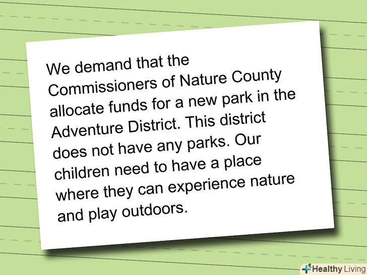 Зробіть свою петицію короткою.люди менш імовірно підтримають вас, якщо їм доведеться витратити багато часу, читаючи те, що ви написали. Незалежно від обсягу вашої петиції, на самому початку першого абзацу ви повинні підкреслити вашу конкретну мету. Потім опишіть причину (и) петиції. Це абзац читає більшість людей.- Приклад першого абзацу петиції: ми вимагаємо, щоб члени Комітету з охорони природи області виділили кошти для нового парку в районі розваг. У цьому районі відсутні парки. Наші діти повинні мати місце, де вони можуть насолоджуватися природою і грати на відкритому повітрі.