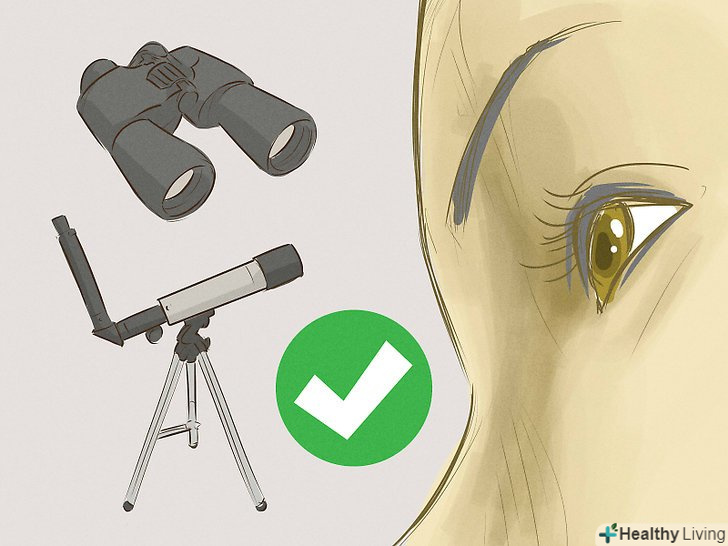 Спостерігати можна як неозброєним оком, так і за допомогою оптичних приладів.місячне затемнення можна абсолютно безпечно спостерігати без будь-яких фільтрів. Вам не знадобиться будь-яке спеціальне обладнання, так як ви не будете дивитися безпосередньо на сонце, а лише на відображення його світла від місяця.[13] оскільки немає ризику пошкодити очі прямим сонячним світлом, не потрібно ніякого спеціального обладнання.[14]- Щоб краще розглянути місячне затемнення, можна спостерігати за ним через бінокль або телескоп.