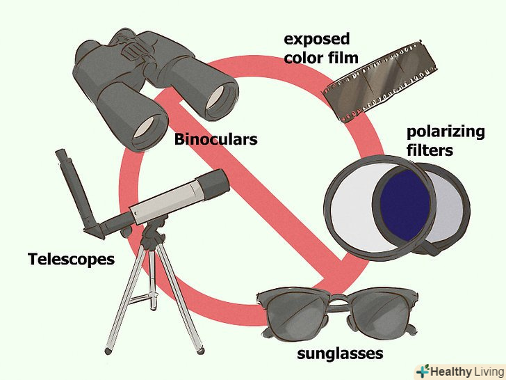 Пам'ятайте про методи, якими не можна користуватися при спостереженні сонячного затемнення. не можна спостерігати за затемненням через бінокль,телескоп , будь-які окуляри, в тому числі сонцезахисні, димчасте скло, поляризаційні світлофільтри або проявлену кольорову фотоплівку-жоден з цих способів не захищає очі належним чином.[4][5]- Хоча перераховані предмети і послаблюють видимий оком світло, вони пропускають невидиму частину спектра, яка також шкідлива для зору; через них проходять ультрафіолетові та інфрачервоні промені, не менш шкідливі ніж видиме світло.