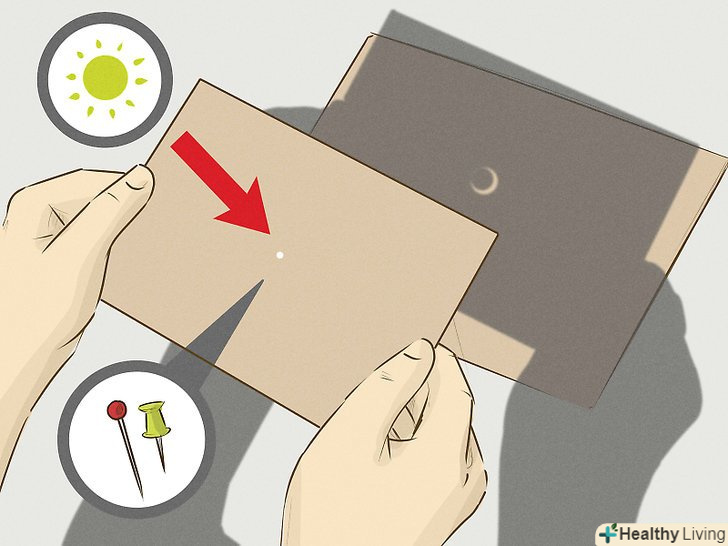 Зробіть пристрій для спостереження за затемненням (проектор з точковою діафрагмою).зробити такий пристрій в домашніх умовах абсолютно нескладно, і, взагалі кажучи, воно є найбільш доступним і надійним пристроєм для безпечного спостереження за затемненням (його вартість дорівнює ціні аркуша щільного паперу). До недоліку даного способу можна віднести малий розмір зображення, проте дітям і підліткам дуже подобається сам процес виготовлення такого проектора і подальше спостереження з його допомогою за затемненням.[6]- Візьміть аркуш щільного паперу або картону і шпилькою або креслярської кнопкою виконайте в його центрі отвір. Покладіть другий аркуш паперу на землю - це буде екран, на який ви спроектуєте зображення затемнення.