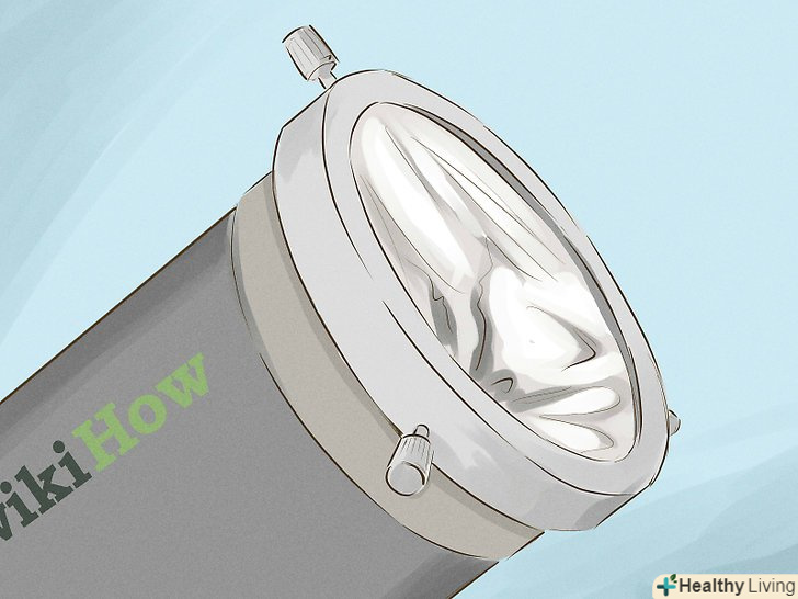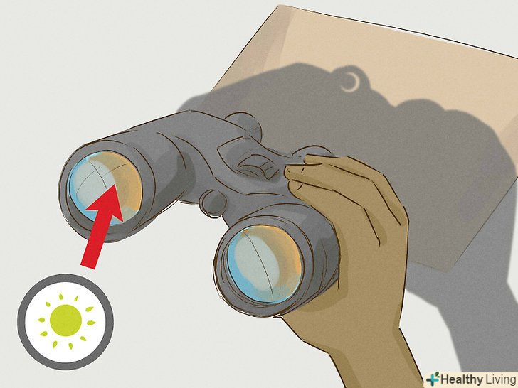 Спостерігайте за затемненням непрямим методом, за допомогою проекції.ще один безпечний метод непрямого спостереження полягає в тому, щоб отримати проекцію за допомогою бінокля або телескопа. Однак пам'ятайте, що даний метод безпечний лише при отриманні проекції зображення, ні в якому разі не заглядайте при цьому в бінокль або телескоп![8]- Прикрийте одну з двох передніх лінз бінокля кришкою або, якщо її немає, листком картону.