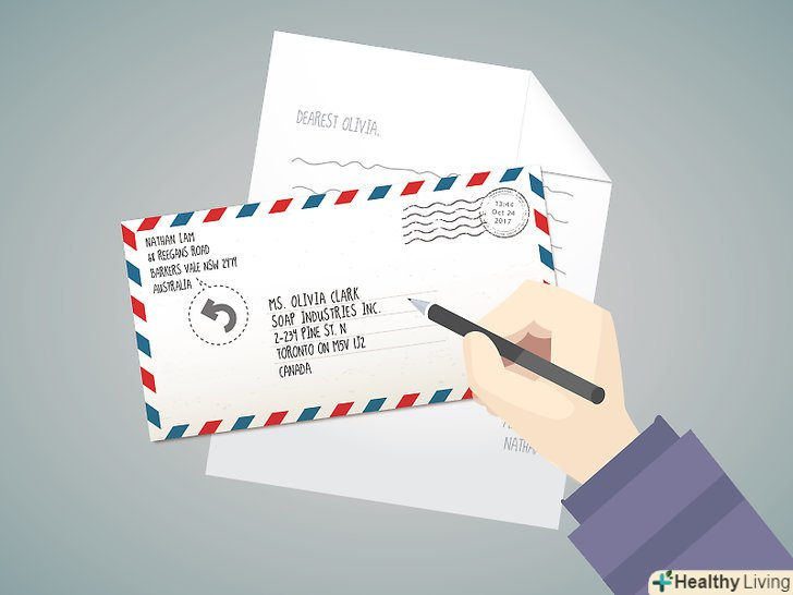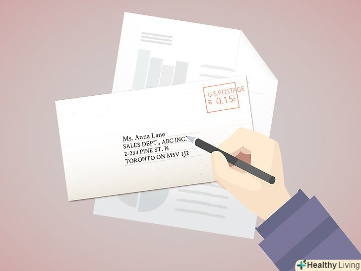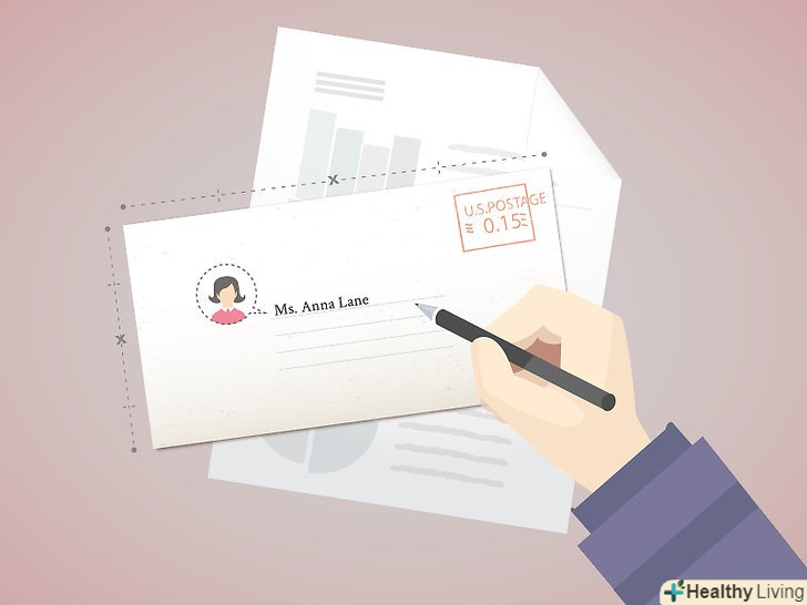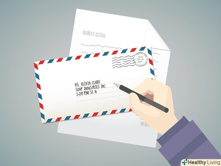 Вкажіть ім'я одержувача. напишіть ім'я в середині передньої частини конверта і обов'язково залиште достатньо місця над цим рядком і під нею. Можна додати шанобливе звернення, наприклад « " Mr.«або " Mrs.", але це необов'язково.- Як правило, Поштові служби вимагають, щоб всі адреси були написані великими або друкованими літерами.[1]