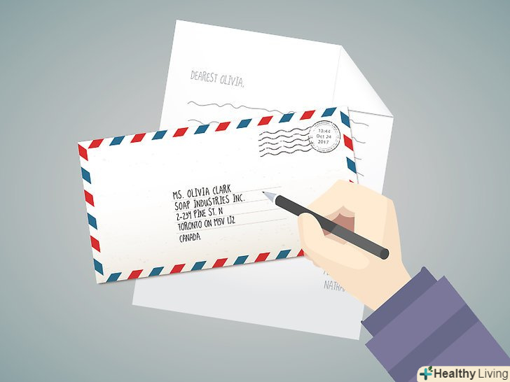 Напишіть "Canada" в останньому рядку.назва країни завжди повинна знаходитися на останньому рядку адреси, якщо тільки ви не відправляєте лист з Канади (в такому випадку цей рядок необов'язкова).- Нижче наведено правильно написану адресу, де розриви рядків позначені комами. Rachel Platt, PEARSON EDITORIAL INC., 2-234 Pine St. N, TORONTO ON M5V 1J2