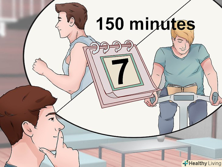 Виберіть вид аеробного тренування.існує дуже багато різних занять для аеробних вправ. Можете зайнятися яким-небудь командним видом спорту, виходити на прогулянки з друзями або відвідувати тренажерний зал. Обов'язково відзначайте для себе інтенсивність своїх тренувань.[13]- До помірної фізичної активності можна віднести швидку прогулянку зі швидкістю 4,5-5 км/год, або їзду на велосипеді зі швидкістю менше 15 км/год. Парний великий теніс, бальні танці або робота в городі також стануть хорошою помірною тренуванням.