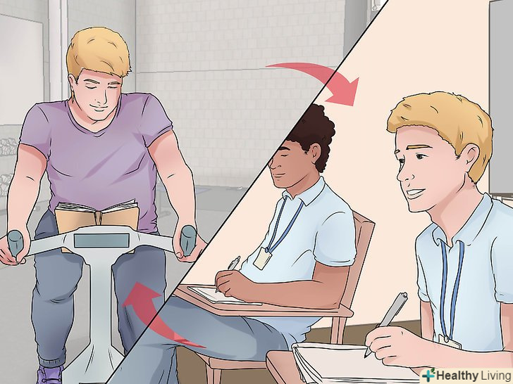 - Щоб займатися спортом під час навчання візьміть свій зошит або конспект в спортзал. Сидячи на велотренажері, перечитуйте матеріали протягом хоча б півгодини, встановивши на тренажері легкий режим. Можна також використовувати орбітрек, бігову доріжку або степпер.[4]