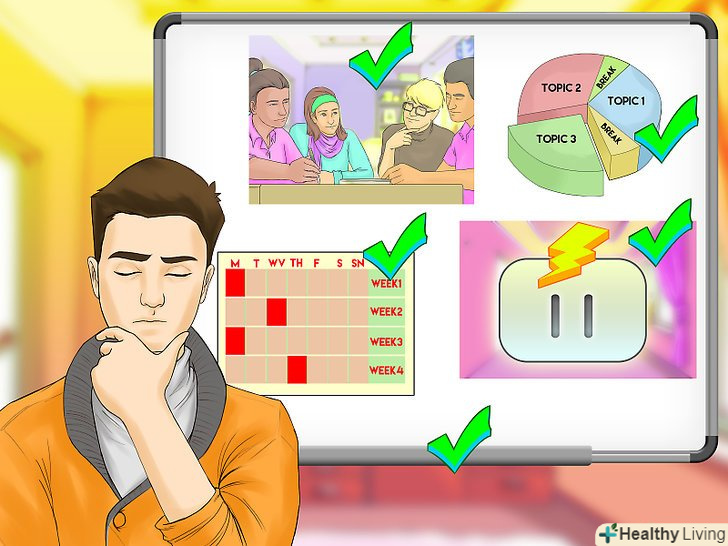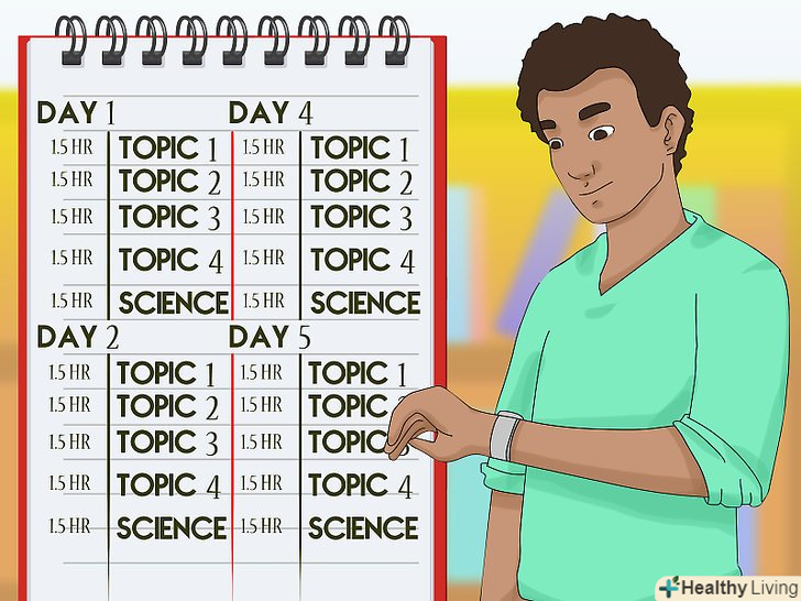 - Враховуйте інші заняття, які можуть з'явитися в графіку і скоротити час навчання. Це може бути підробіток, Відпочинок з друзями або допомога батькам. Такі справи теж важливі, але як і в навчанні, у всьому потрібна помірність. Не забувайте виділяти час на відпочинок, але не на шкоду навчанню.[19]