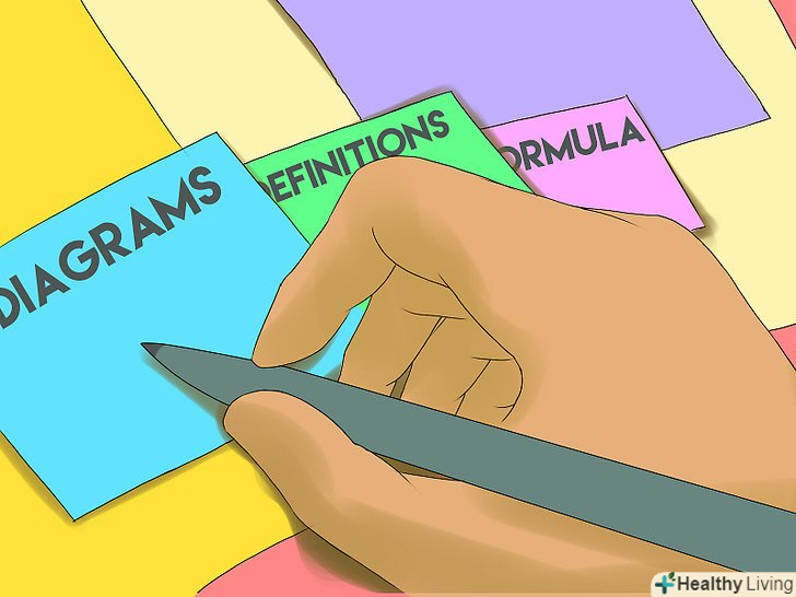 Використовуйте картки. вони підходять не для всієї інформації, але точно підійдуть для термінів і понять з конкретними визначеннями, графіками, схемами і формулами. Можна використовувати картки двома способами: самоперевірка – напишіть з одного боку питання, а з іншого відповідь; повторення – використовуйте тільки одну сторону.[36]- Картки не обов'язково повинні бути одного розміру (тобто маленькими, з щільного картону). Деякі наукові теми занадто складні для маленьких карток. Якщо потрібно, то використовуйте папір великого формату.