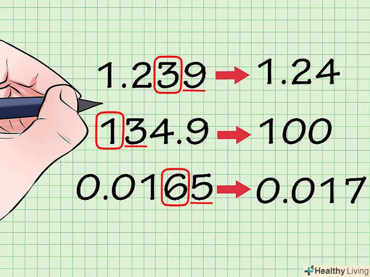 Округліть число до заданої кількості значущих цифр.це залежить від завдання, над яким ви працюєте. Якщо, наприклад, ви округляєте число до двох значущих цифр, то вам необхідно визначити другу значущу цифру числа і потім за допомогою цифр праворуч від неї вирішити, округляти її вниз або вгору. Ось кілька прикладів:- 1,239 округляється до трьох значущих цифр в 1,24. Це тому, що цифра праворуч від третьої цифри 3 є 9.