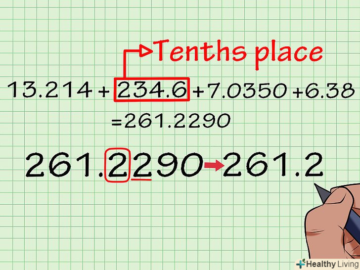 Округліть до знайденого числа значущих цифр при додаванні.щоб зробити це, потрібно спочатку скласти числа, які вам дані. Потім знайти число з найменшою кількістю значущих цифр, а потім округлити результат підсумовування до знайденої кількості значущих цифр. Ось як це робиться:- 13,214 + 234,6 + 7,0350 + 6,38 = 261,2290